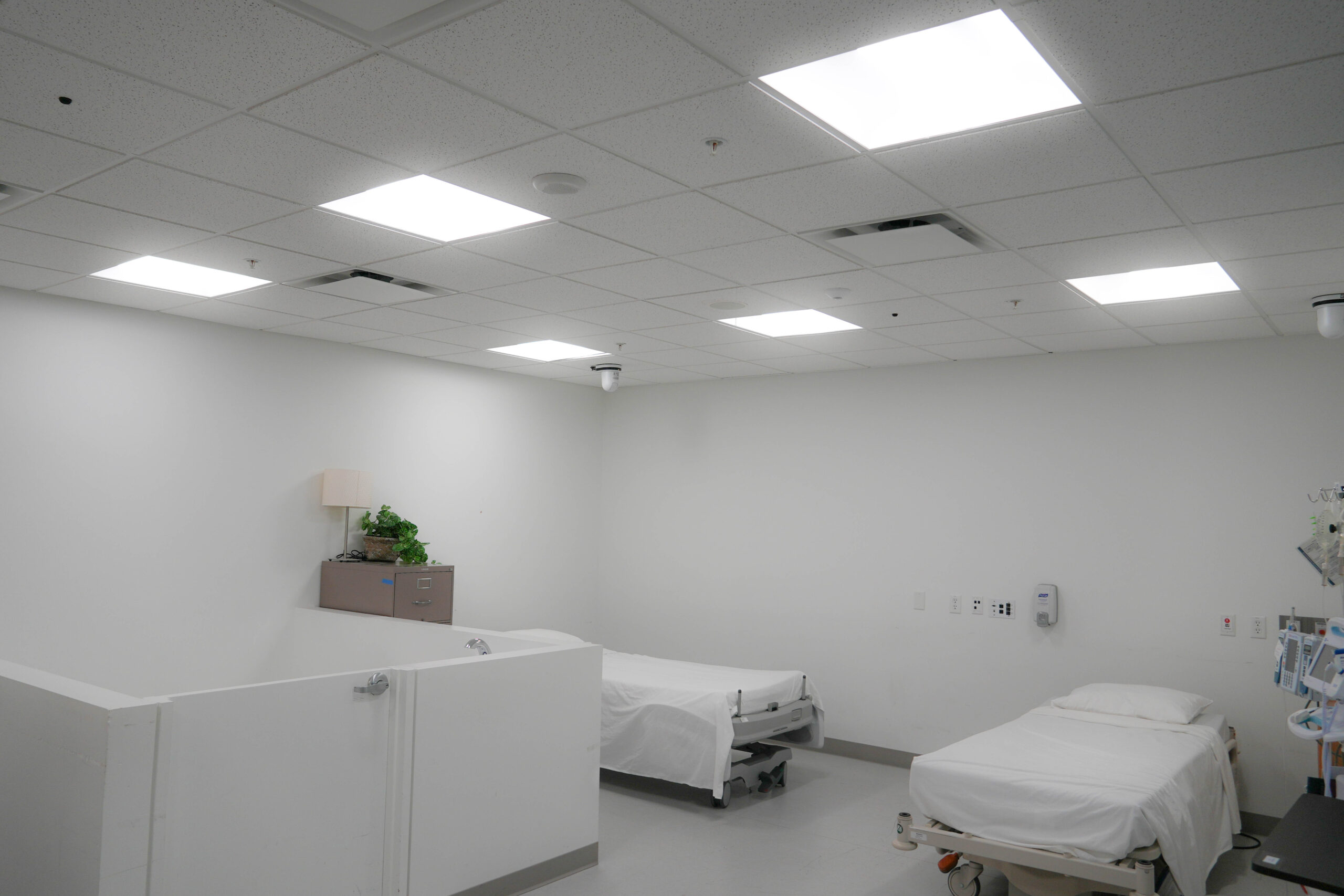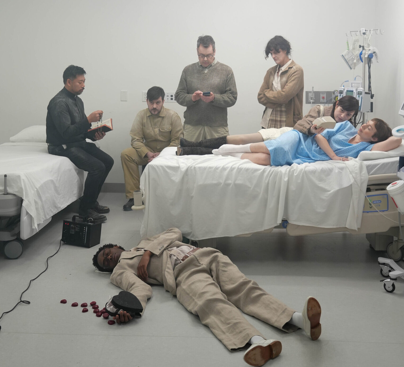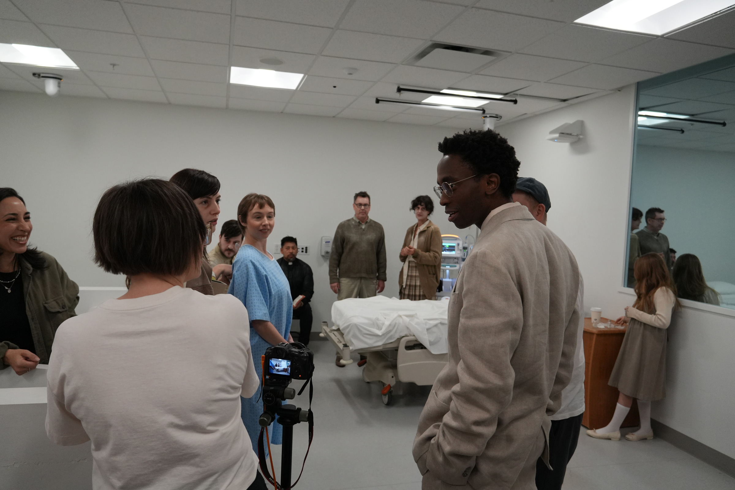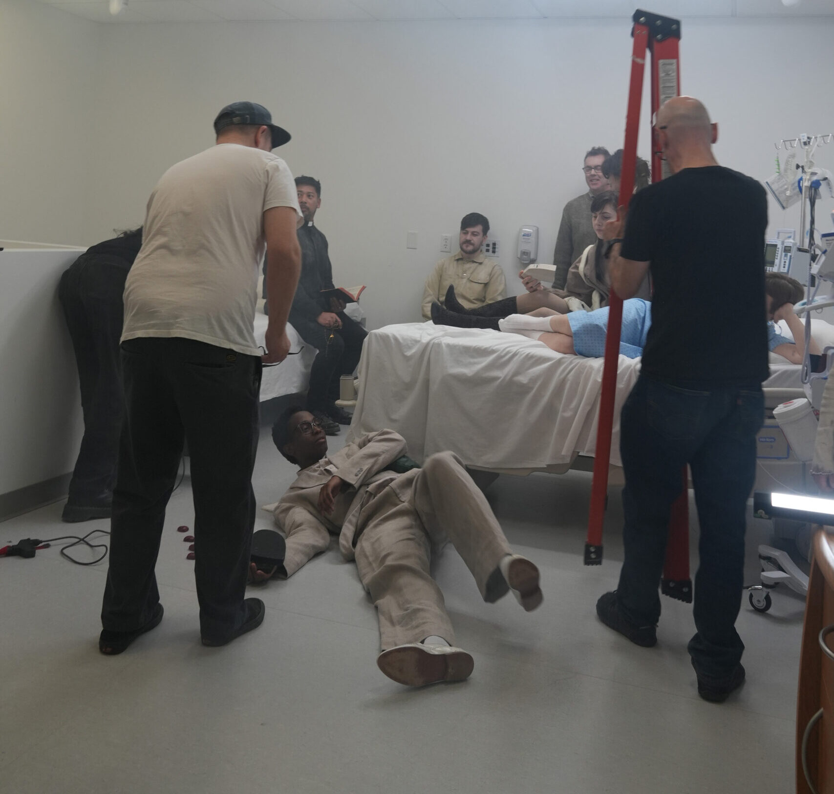 All seven actors remain in position as artificial fog continues to settle across the room, softening the fluorescent light of the hospital set. In the foreground, a crew member adjusts a ladder in preparation for the next lighting change, moving carefully so as not to disturb the actors holding their marks. The actors quietly review their lines while waiting, maintaining focus as technical adjustments unfold around them. This image highlights the layered coordination of the shoot, where performance and production happen simultaneously, and moments of waiting are shaped by ongoing movement just outside the frame.