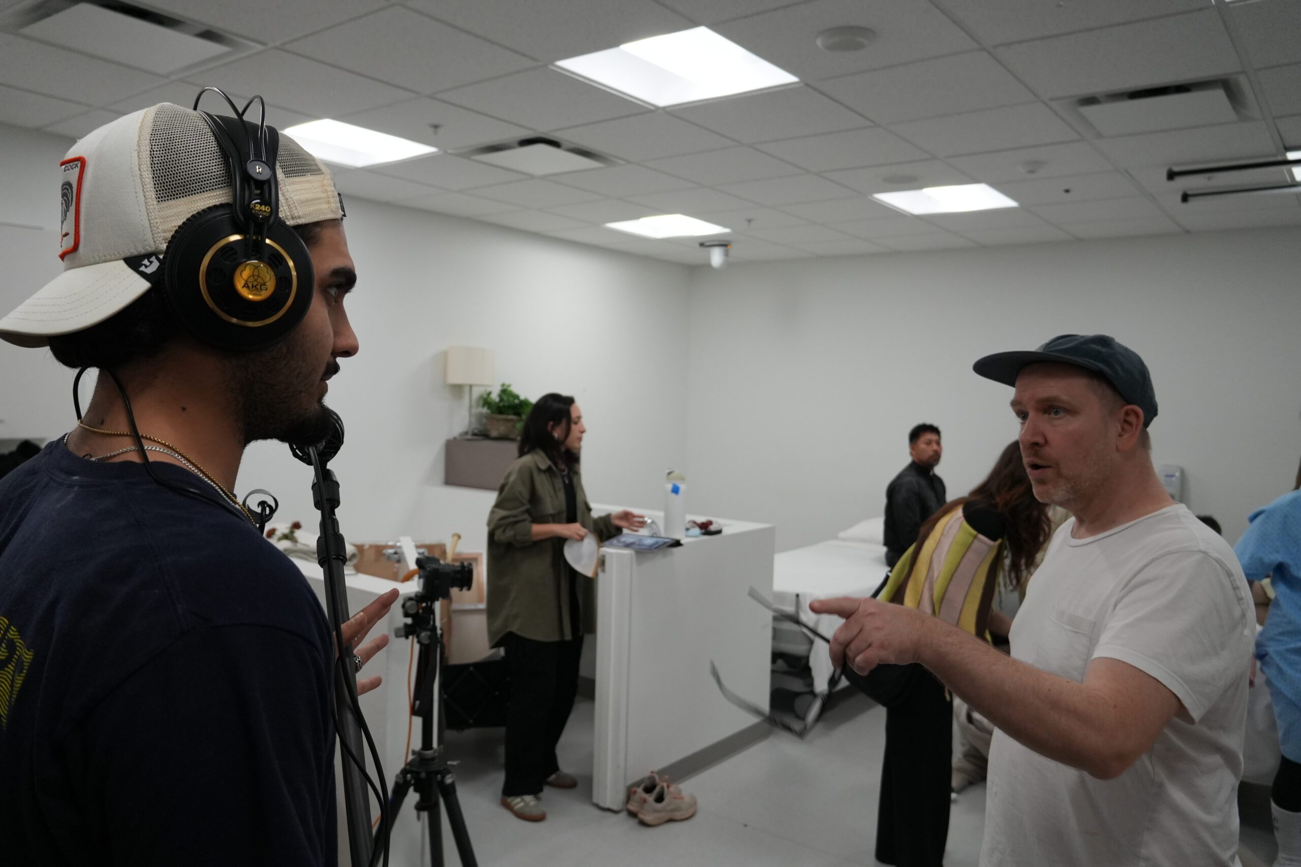 A photography student volunteering on the project speaks with Trevor while the set remains active around them, using the pause to ask questions and observe decisions being made in real time. Their body language suggests focused engagement, with attention directed toward both the conversation and the surrounding production environment. This exchange reflects the collaborative nature of the shoot, where instruction, curiosity, and shared problem-solving unfold alongside the making of images.