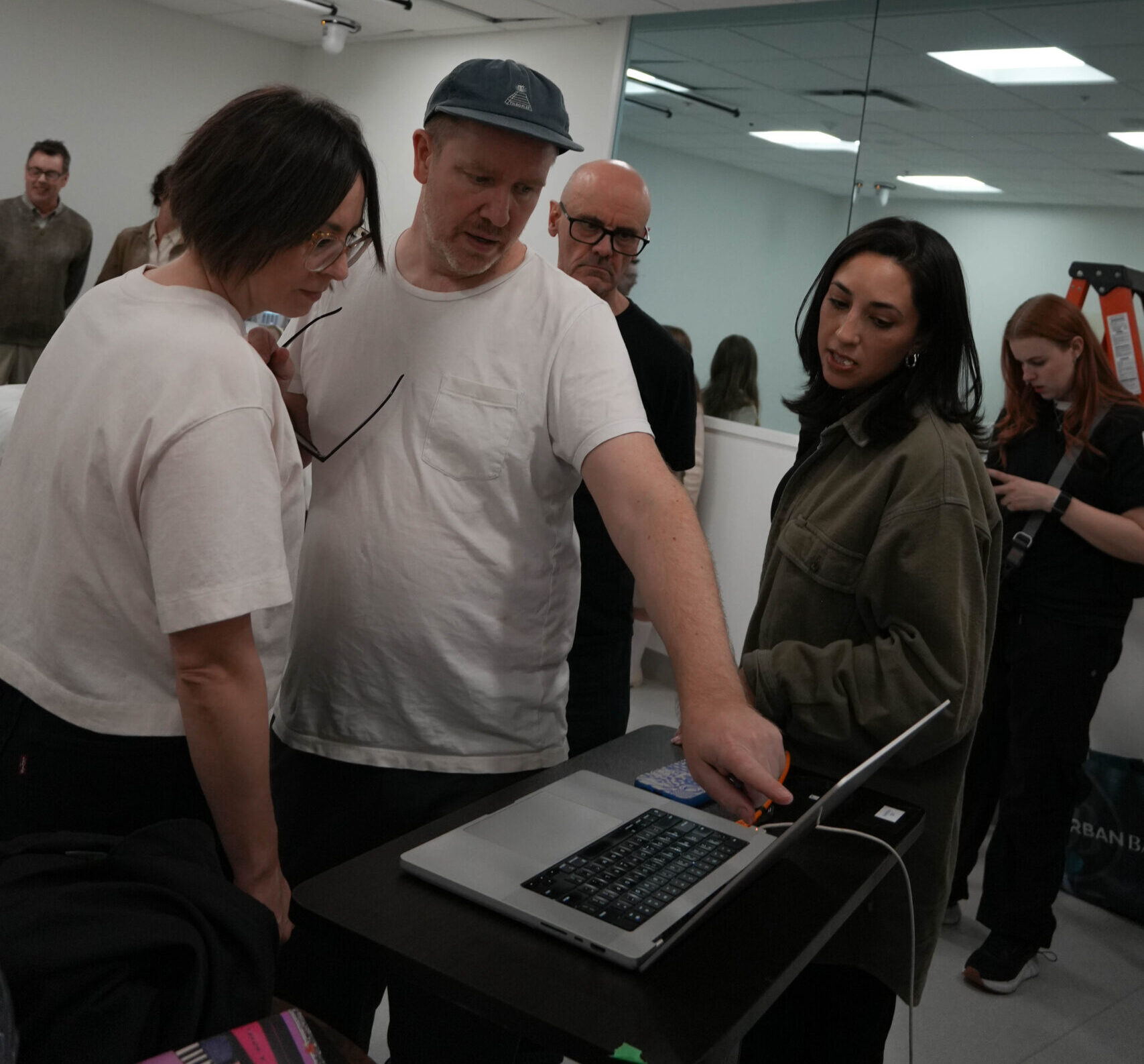 Trevor and Tanya stand with the rest of the team gathered around a laptop, reviewing the most recent image taken during the hospital scene setup at Langara College. The screen becomes a temporary meeting point, drawing everyone into a shared pause as they assess framing, lighting, and small details that need adjustment. Conversations overlap quietly — fingers point toward the monitor, suggestions are exchanged, and decisions are negotiated in real time. This moment reflects the collaborative nature of the process, where the image is not yet final but constantly evolving through collective attention and discussion before the next attempt is made.