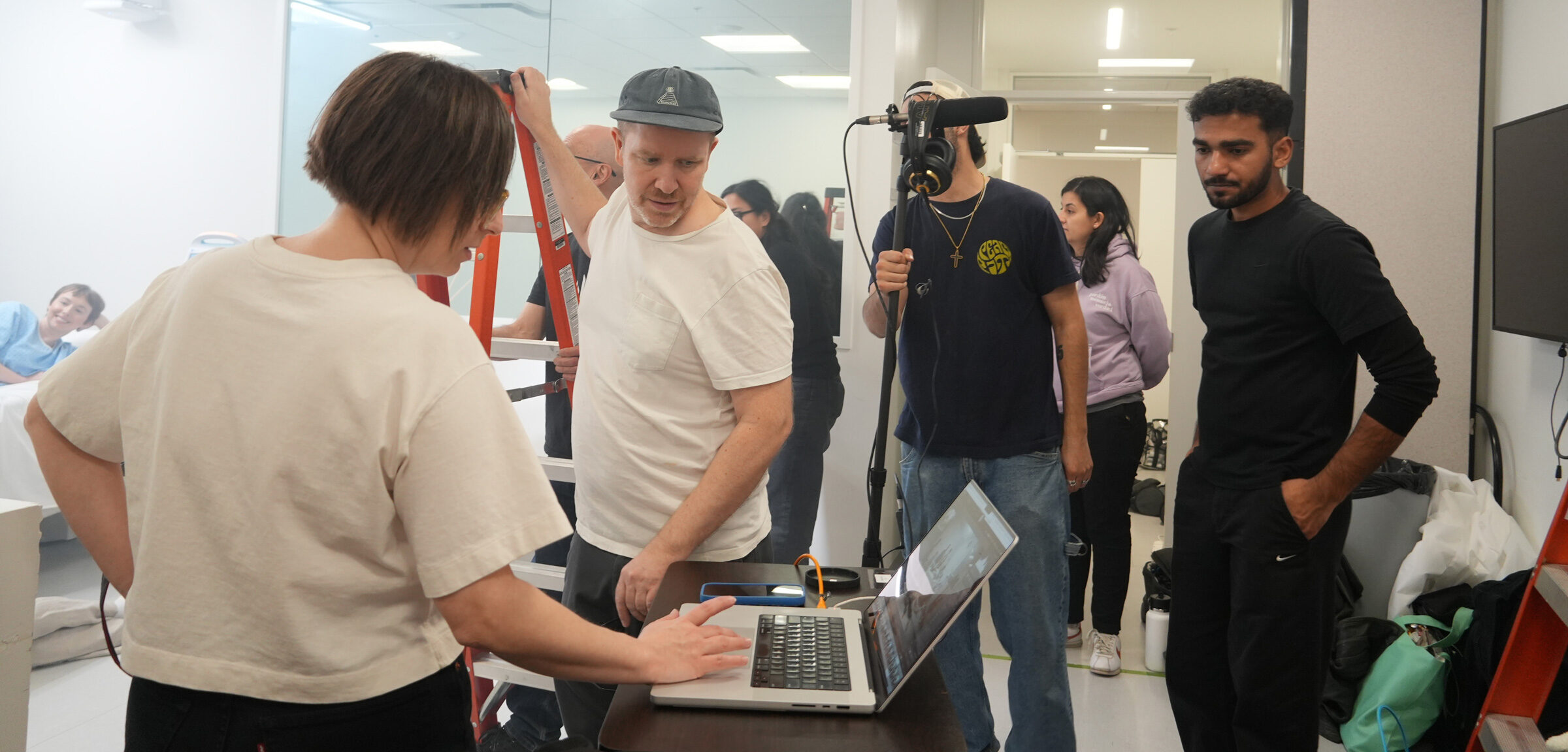 Tanya and Trevor review the images displayed on the screen while remaining physically engaged with the set, Trevor resting one hand on the ladder as if prepared to reposition it at any moment. The act of evaluation and adjustment happens simultaneously, blurring the line between reflection and action. Nearby, two students observe closely, one holding a microphone boom, waiting for the next cue, their attention fixed on the exchange as decisions are made in real time. This moment captures the layered dynamics of the shoot, where learning, authorship, and technical execution unfold together within the same compressed space.