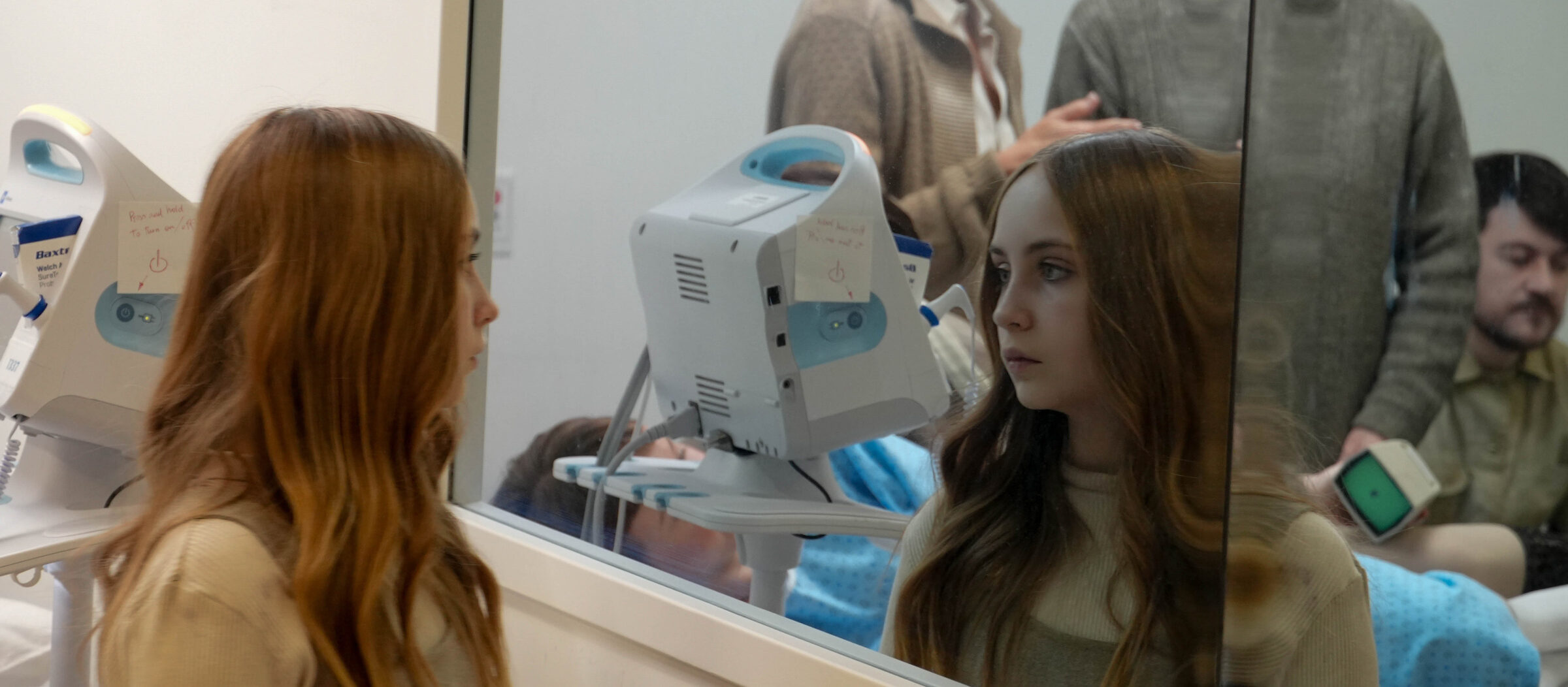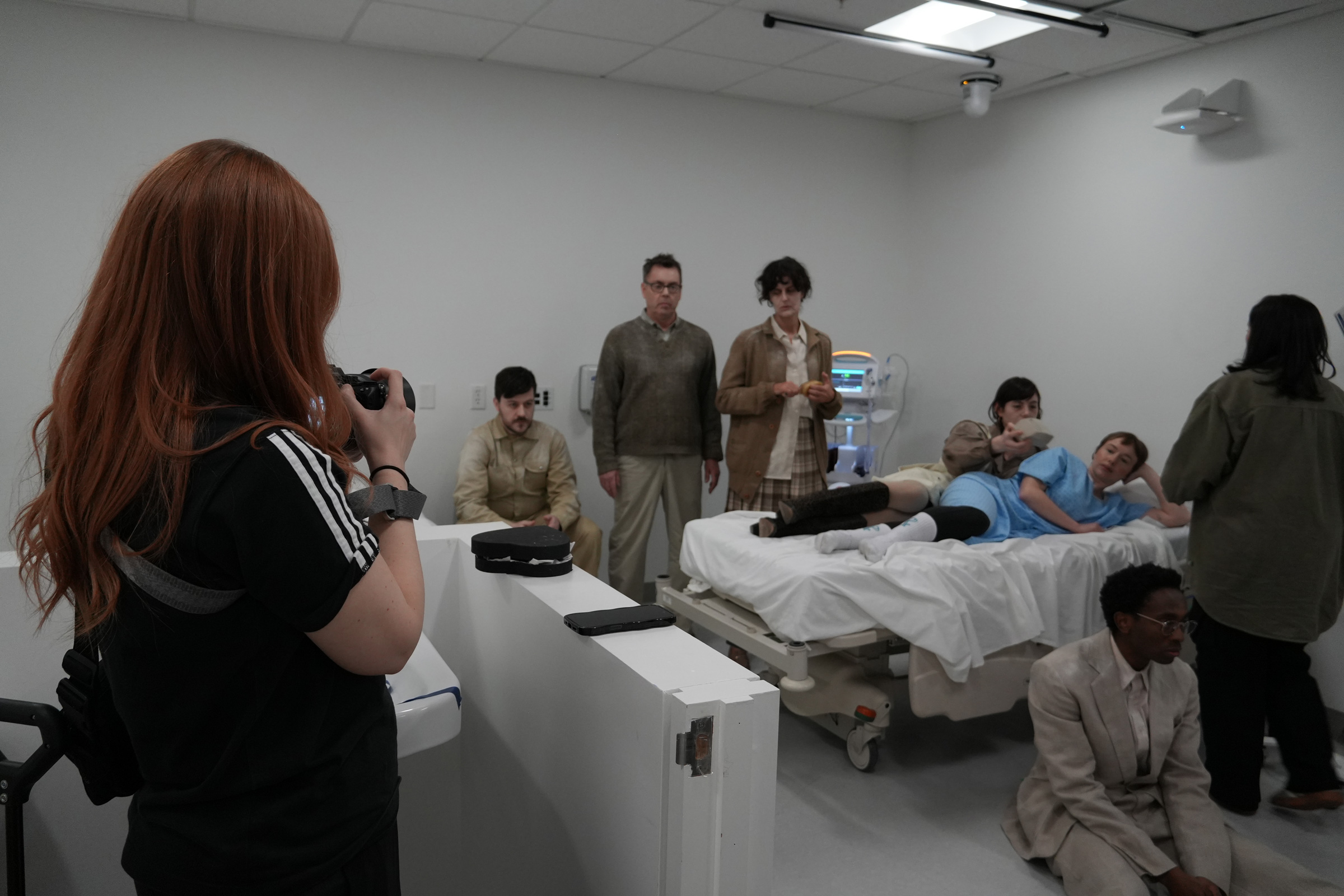 A photography student volunteering on the project photographs the hospital set while the actors remain in position, waiting for the next instruction. The image excludes the technical crew, centering attention on the actors’ quiet stillness as time stretches between takes. Their expressions and posture suggest a pause filled with anticipation rather than inactivity, shaped by repetition and restraint. This photograph emphasizes waiting as an essential part of production, where performance exists even before the camera signals readiness.