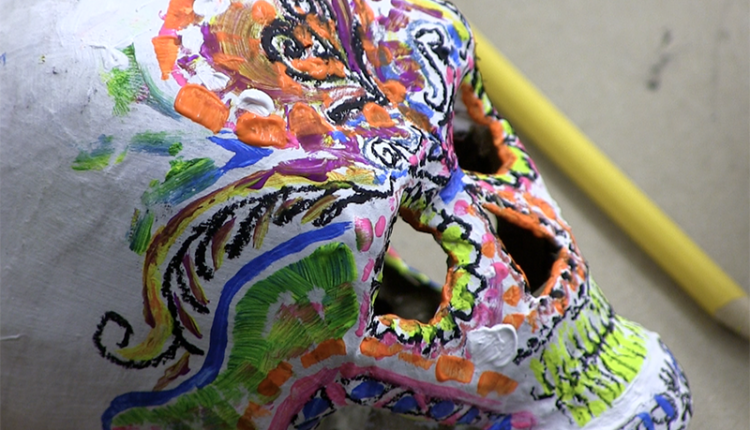 Neon paint, flowers and intricate designs cover the faces of skulls at the Museum of Anthropology during a workshop on Saturday. But it’s not to be confused with Halloween.