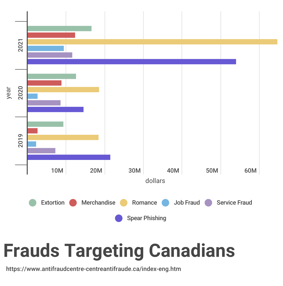According to the Canadian Anti-Fraud Centre, in 2021 there were 106,637 frauds reported by 67,724 victims and $75.5 million dollars have been lost to fraud.